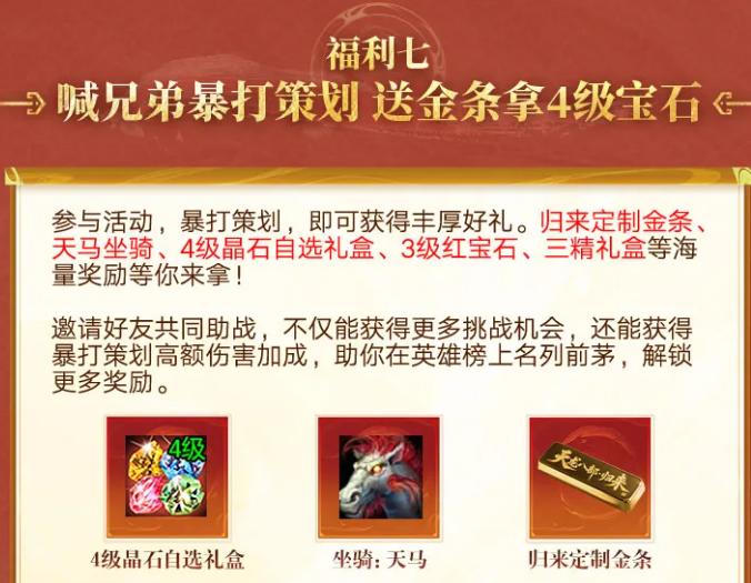 这里有个可以暴打策划的活动,参与就能拿到4级晶石自选礼盒和两颗3级红宝石。冲级大赛的奖励更丰厚,直接赠送三种永久大翅膀坐骑、超酷的专属称号,另外还有免费的武器幻饰以及为回归玩家定制的金条。