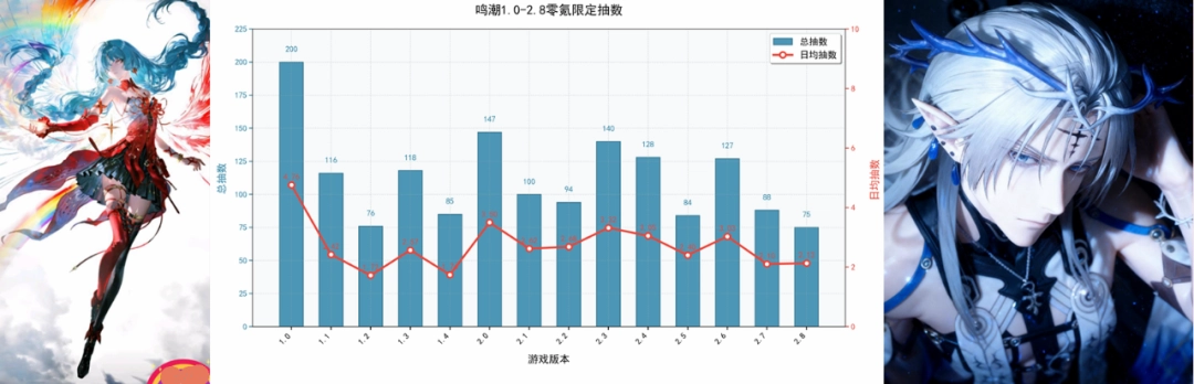 在对各版本资源进行统计后,不同的“声音”开始出现——零氪玩家对2.8版本仅能获得75抽资源的情况表达了不满。而自鸣潮2.2版本之后,零氪玩家的抽卡资源基本维持在80抽至120抽的区间循环(其中120多抽的情况,是包含了线下活动以及提名获奖、周年庆、补偿等重要节点或节奏事件所带来的额外资源)。