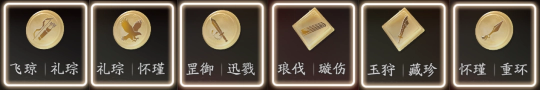 礼琮是必带的,其他刻玉就挑词条好的带。要是“飞琼|礼琮”没什么好词条,也可以考虑换成“礼琮|怀瑾”。同样的道理,如果“玉狩|藏珍”这个组合没有暴击率词条,那就换成“怀瑾|重环”。