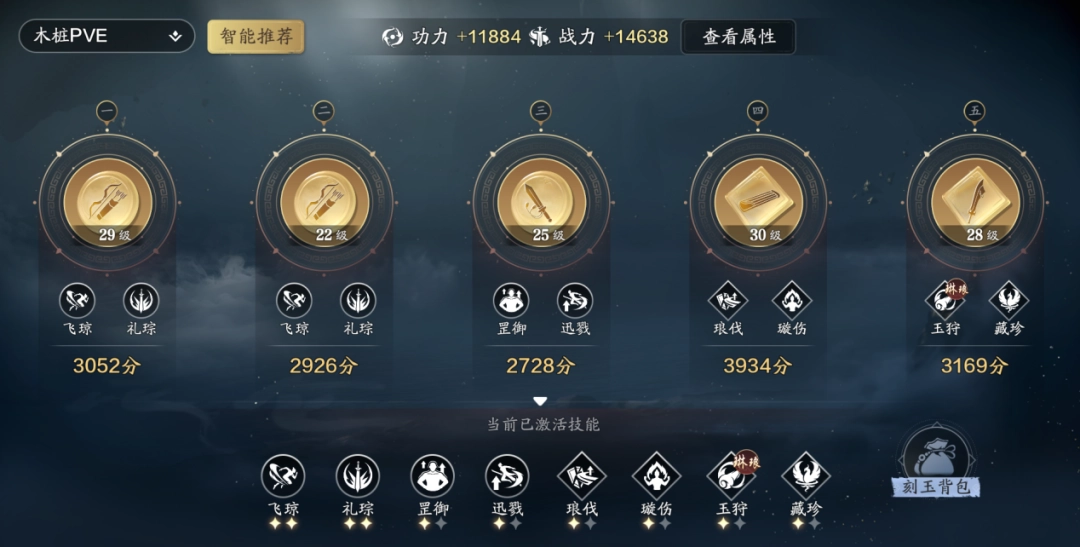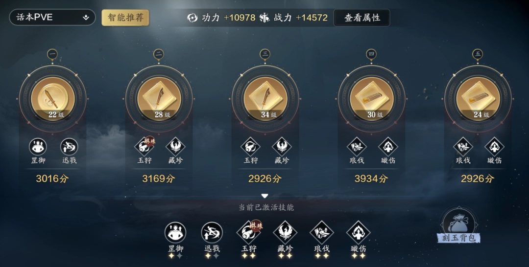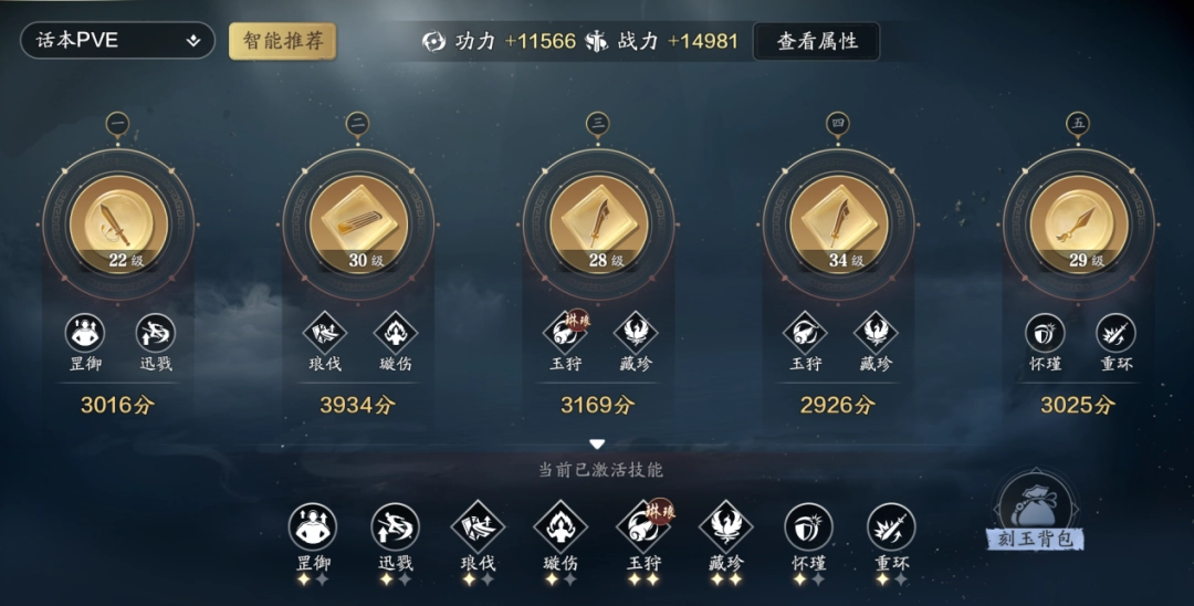 PVE的输出方案中,将从“罡御|迅戮”、“琅伐|璇伤”、“玉狩|藏珍”、“怀瑾|重环”,这4个刻玉中选择。