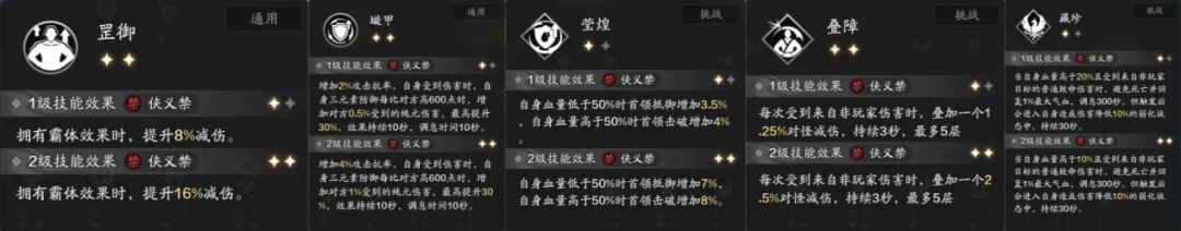 这一套拥有“罡御”、“璇甲”、“莹煌”、“叠障”等技能的减伤,同时也有“藏珍”保命效果,大大提升副本的坦度。