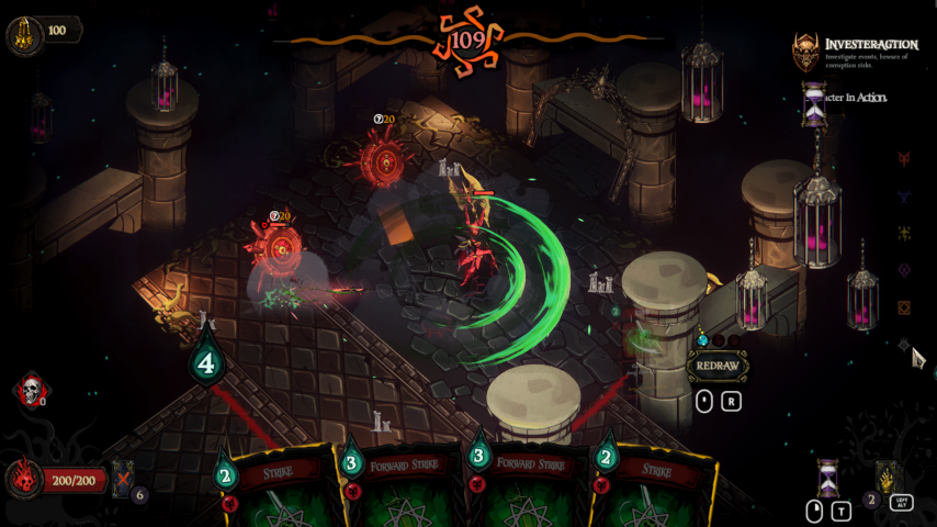 《黄金星漩》在玩法设计上深度融合策略与动作元素,打造出别具一格的战斗体验。该游戏巧妙整合了《Hades》的动作战斗系统与《杀戮尖塔》的卡牌构筑玩法,既延续了卡牌游戏的策略深度,又注入了快节奏动作游戏的操作爽感,玩家需在思索卡牌搭配的同时,精准把握操作时机。此外,游戏中还创新加入“漩涡侵灵”机制:玩家的每一次选择都会触发相应事件,这些事件不仅会左右游戏进程,还会直接侵蚀主角的意志,为战局增添更多变数。