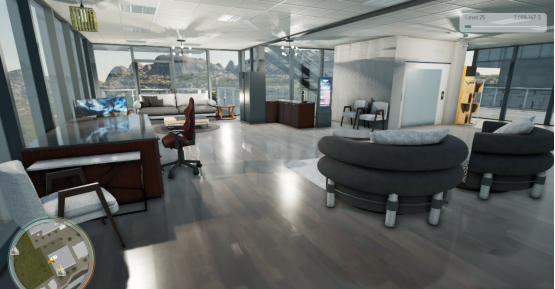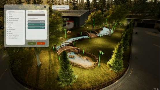 玩家能够购置并升级自己的办公室,把一片空地打造成设施完备的公司总部。可供选择的升级项目有仓库、车库、自助餐厅、篮球场、风力涡轮机等。