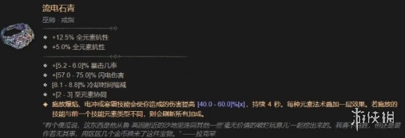 流电石青的主要获取途径是击败督瑞尔、安达莉尔、憎恨先驱这类Boss。此外,在梦魇地城中探索时,带有赫拉迪姆秘密词缀的宝箱也值得探险者留意。在《暗黑破坏神4》里,流电石青能提供的属性包括+12.5%全元素抗性、+5.0%全元素抗性,以及+[5.2 - 6.0]%暴击几率等。