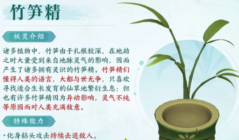在游戏中形形色色常见的植物精怪里,玩家时常会接触到的有竹笋精、荷花妖、南瓜精等。这些植物精怪在战斗时皆能充当玩家的助力,发挥各异的功效。例如,竹笋精能够协助玩家击退敌人,南瓜精可以阻挡敌方前行,荷花妖则能够对敌方施毒等等。