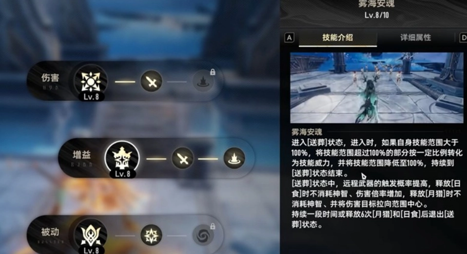 妮弗尔夫人的增益技能“雾海安魂”会让她进入“送葬状态”。在此状态下,她技能攻击范围外的溢出部分将得到额外伤害加成,溢出程度越高,强化效果就越显著。此外,处于该状态时释放技能不会消耗神智,日食的伤害倍率会有所提升,月猎还会附带聚怪效果。