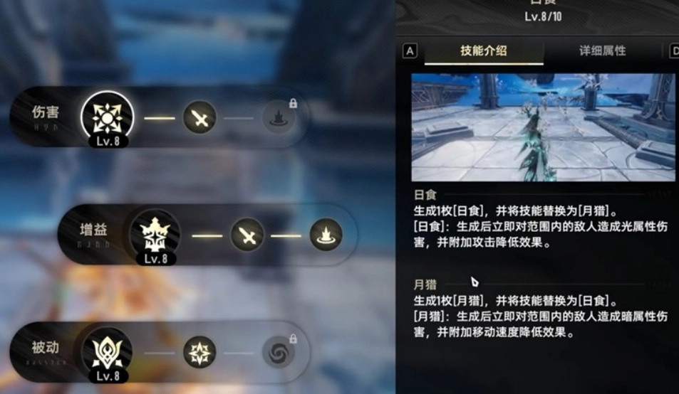 妮弗尔夫人的核心输出技能存在“日食”与“月猎”两种状态,且这两种状态会循环切换,其中“日食”是其一。