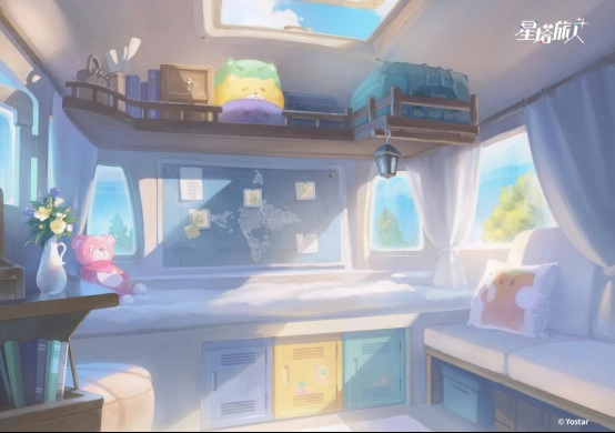 《星塔旅人》运用了辨识度极高的赛璐璐风格美术,以“旅行”为核心主题,围绕旅人们的代步工具与带有“时空穿梭感”的各类物品展开了全面的视觉设计,呈现出清新且富有活力的画面效果。在场景绘制方面,游戏融入了水彩笔触的表现手法,既确保了画面的美感,又能让角色在场景里更加醒目。此外,场景氛围的营造还着重突出怀旧与现代的冲突感,例如魔法师的办公桌上放置着电脑、复古的起居室中摆放着冰箱等设计,使奇幻与都市交融的新奇感始终贯穿于整个游戏体验。