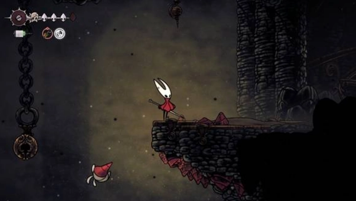 这里会出现一个裁决者和一只螺丝虫。需要注意的是,在裁决者还没开始移动的时候,可以提前跳到它的头顶用一次下劈攻击,这样角色就会被弹到右边的铃铛上。之后再用一次下劈,就能成功站到铃铛上了。接下来向右冲刺,就能直接跳过左边的路线,既节省时间又降低风险。