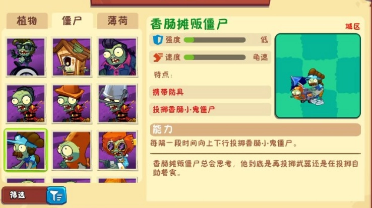 香肠摊贩僵尸 / 香肠小鬼僵尸 摊贩僵尸:强度较弱,带有防护装备,移动速度迟缓,会定期投出香肠小鬼。 香肠小鬼:体型小巧、行动迅速,能够直接对植物发起攻击。