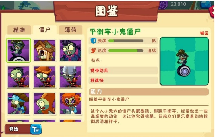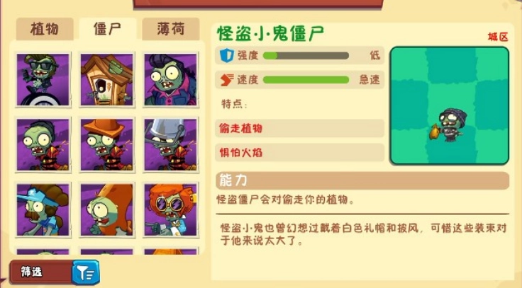 怪盗小鬼僵尸:强度低,速度极快,能偷走已种植的植物,惧怕火焰。应对策略:在后排布置快速攻击型植物,例如火爆辣椒或寒冰菇。