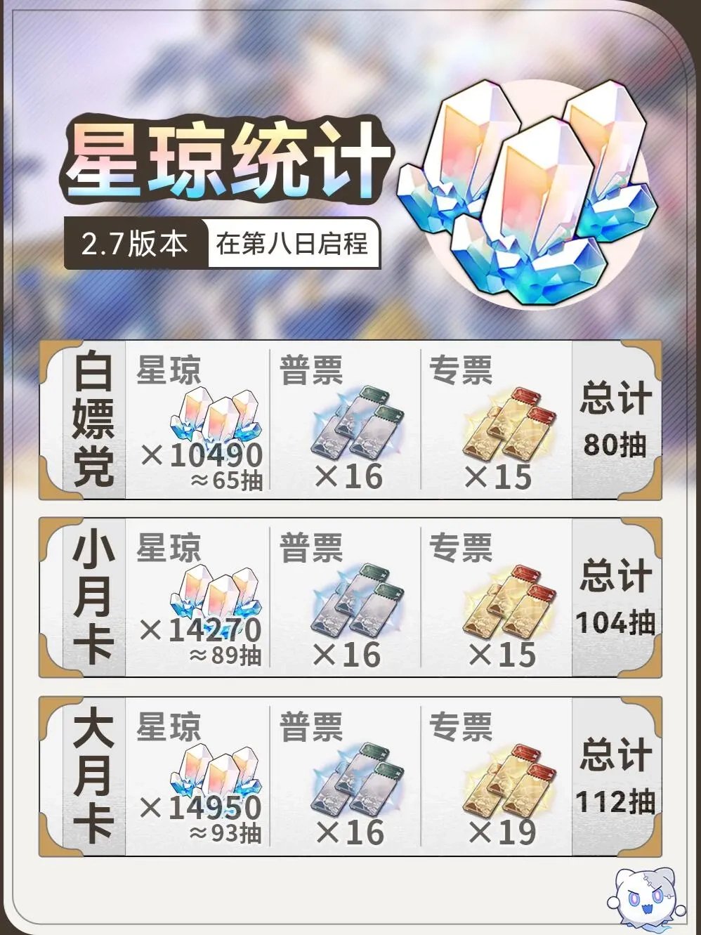 大月卡:在小月卡的基础上,进一步提升每日星琼的获取量。每日可额外获得约30星琼,整个版本期间累计可获得约1260星琼。