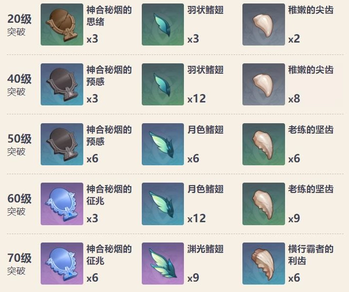 碎链的突破材料涵盖神合秘烟系列的思绪、预感、征兆与启示等多种类型,还有羽状鳍翅、月色鳍翅、渊光鳍翅,以及稚嫩的尖齿、老练的坚齿、横行霸者的利齿。这些材料让碎链的突破过程更为充实,助力其整体属性得到提升。