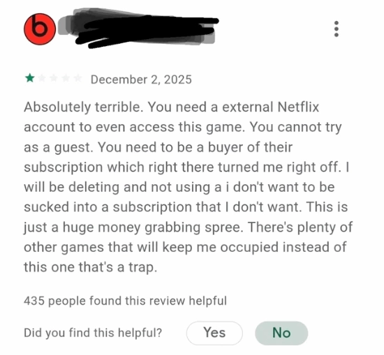 在这些对“网飞游戏需订阅”表示意外的评论里,还夹杂着一些针对游戏性能的合理抱怨。不过大致浏览后就能发现,多数负面评价的核心原因在于,不少用户之前没料到使用游戏需要先订阅会员这一前提条件。
