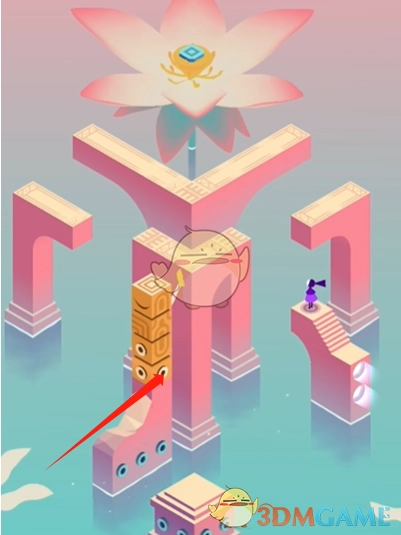 4、接着逐个转动前方的小机关,往右侧推动黄色木块,把木块推至莲花中央。