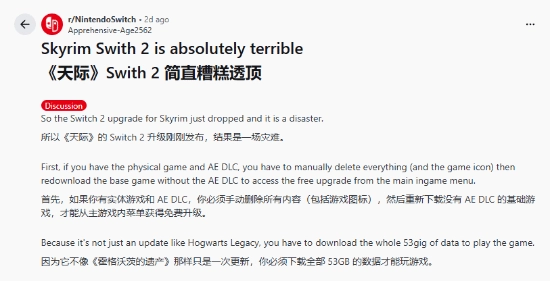 此外,游戏的存储空间占用情况更让人咋舌。Switch2版本的《上古卷轴5》存储空间占用量达到了53GB,相比之下,PC版本仅需25GB。