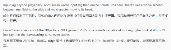 在Reddit论坛上,许多愤怒的玩家把这次移植称作“灾难”。主要的吐槽点聚焦在让人难以忍受的输入延迟和锁定30帧的画面表现上。