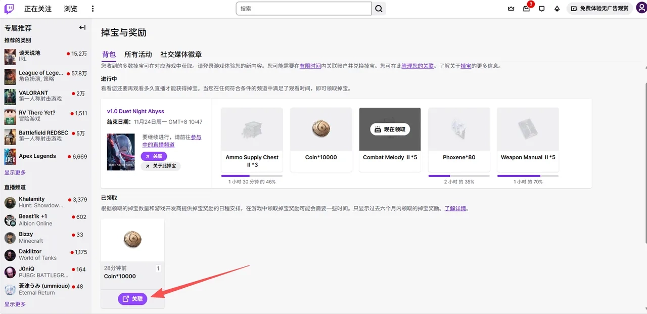 12. 点击“关联”按钮,把奖励绑定至个人游戏账号以完成领取
