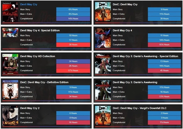 当被问到《鬼泣5》的通关时长时,伊津野英昭透露内部测试显示大约需要15小时,但他没提及对应的难度。从HowLongToBeat的数据来看,《鬼泣》系列过往作品的游戏时长在6到11小时之间,由此推测《鬼泣5》的内容会更为充实。