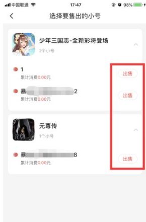 2、挑选打算售出的小号,点击“出售”按钮,具体操作如以下图示。