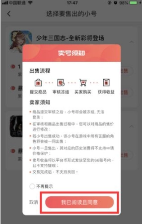 3、届时会弹出一个卖号须知窗口,仔细阅读完毕后,点击“我已阅读且同意”,具体位置如下图所示。