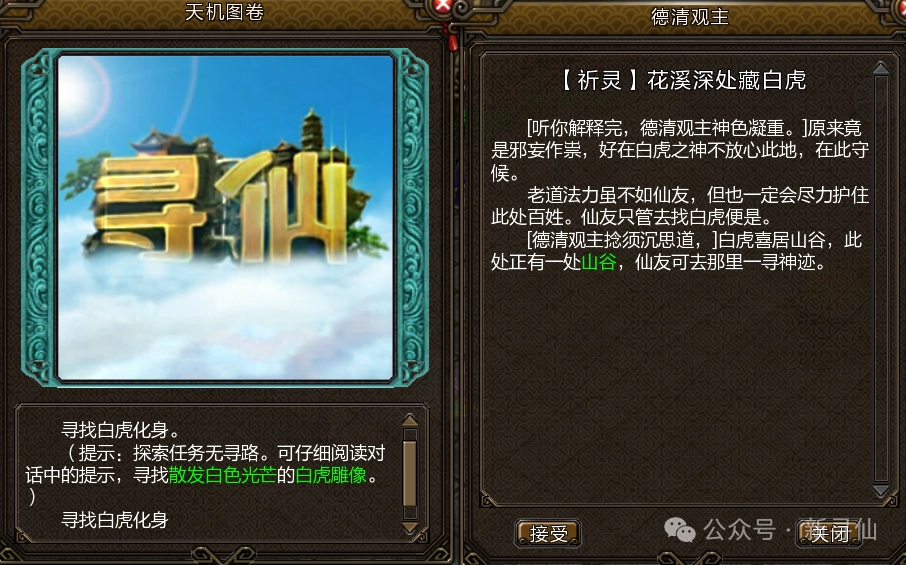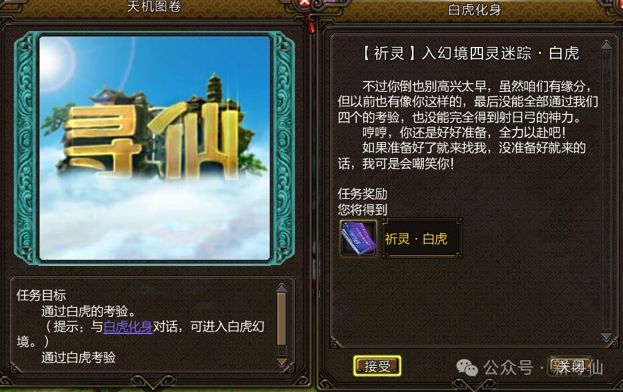 你需要前往密林县找到德清观主,从他那里接取名为“花溪深处藏白虎”的任务。之后前往花溪谷(坐标870, 935)找到白虎化身,进入幻境并完成其中的挑战。