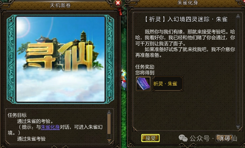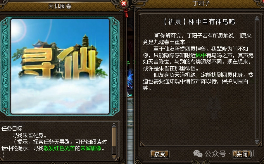 前往宁阳观,找到丁阳子对其使用仙派召集令寻找朱雀化身坐标(2512,1559)入幻境完成挑战。