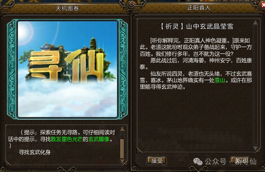 前往五宁宫,对正阳真人使用仙派召集令接取任务山中玄武晶莹雪,找到玄武化身坐标(2503,2137)入幻境完成挑战。