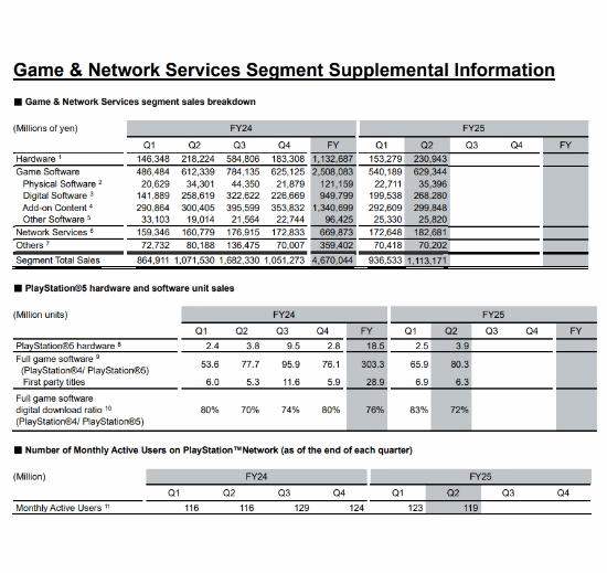 索尼发布了2025-2026财年第二季度的财务报告,以下为部分关键数据: