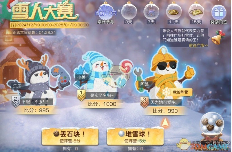12 月 19 日至 1 月 8 日,一年一度的雪人大赛盛大开启!在此期间,乐乐、小美、阿酷将限时回归。