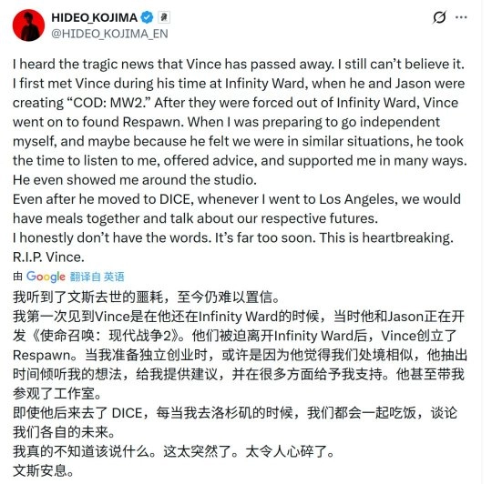 我初次与Vince相识时,他还在Infinity Ward任职,那时他正和Jason一同开发《使命召唤:现代战争2》。在他们被迫离开Infinity Ward后,Vince创办了Respawn工作室。当我准备独立创业、迈出那关键一步时,或许是他觉得我们的境遇有些相似,便愿意抽出时间倾听我的想法,给我提出建议,还在不少方面给予了我支持——他甚至带我参观了他的工作室。后来即便他去了DICE,只要我到洛杉矶,我们总会找机会一起吃饭,聊聊彼此对未来的规划。现在我实在难以用言语表达心情,这一切发生得太早了,真的令人心碎。愿Vince安息。R.I.P. Vince。