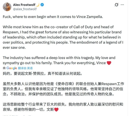 “我对Vince Zampella的离世感到无比悲痛。他是一位重塑了现代游戏的创作者,通过他的远见、领导力和对品质的坚持,在行业中留下了不可磨灭的印记。他的作品为竞技体验和玩家体验树立了新标准,影响了跨越多个类型的无数开发者。”
