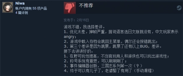 目前,《三国志13:威力加强版》的好评率仅为36%,差评率则高达64%。玩家给出差评的原因主要集中在以下几个方面: