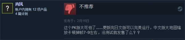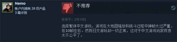 1、繁体中文版本的优化效果不佳,日文版本运行起来却十分流畅,这让国内玩家感到非常不满。