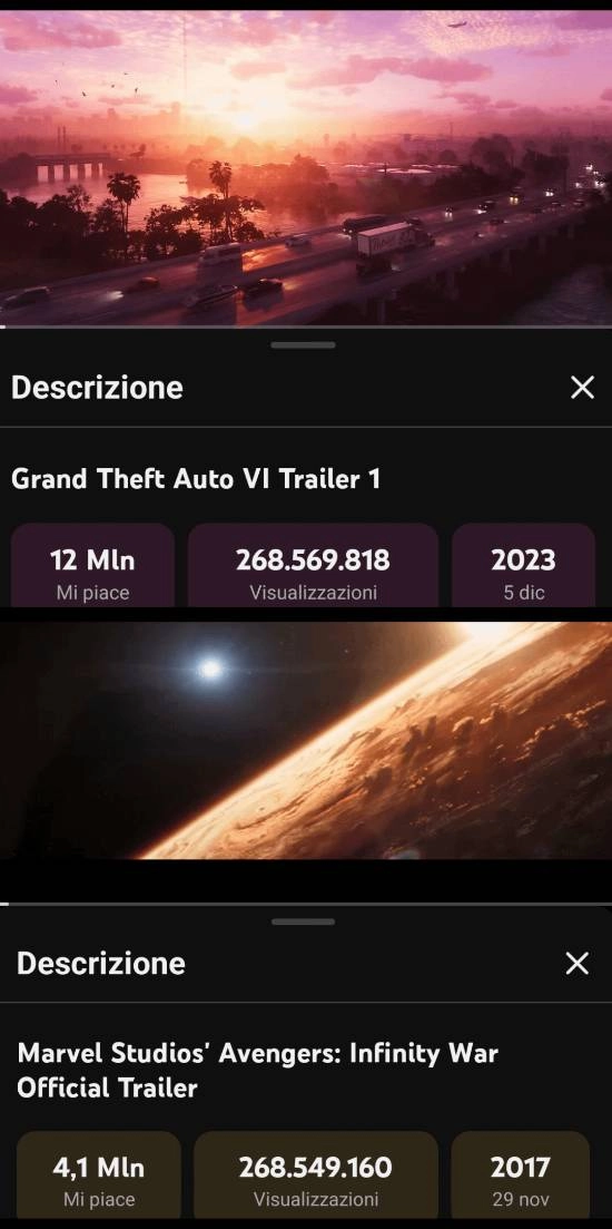 《GTA6》的首支预告片播放量昨日已达2.68亿次,这一数据超越了《复仇者联盟3》,目前仍在向2.7亿次的目标迈进。