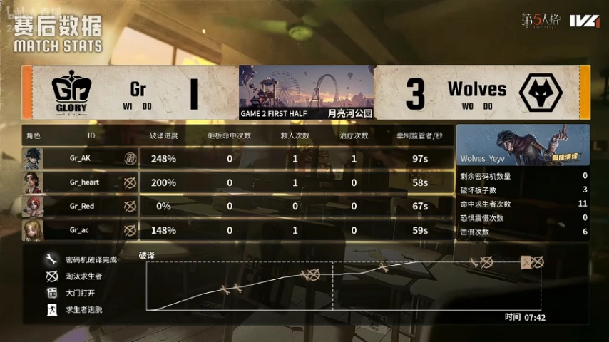 Gr的求生者阵营选定了“小女孩”、大副、弓箭手与病患,并禁用了时空之影;成都Wolves的监管者选手Yeyv则选择了杂货商,同时禁用了火灾调查员、飞行家、佣兵和“心理学家”。