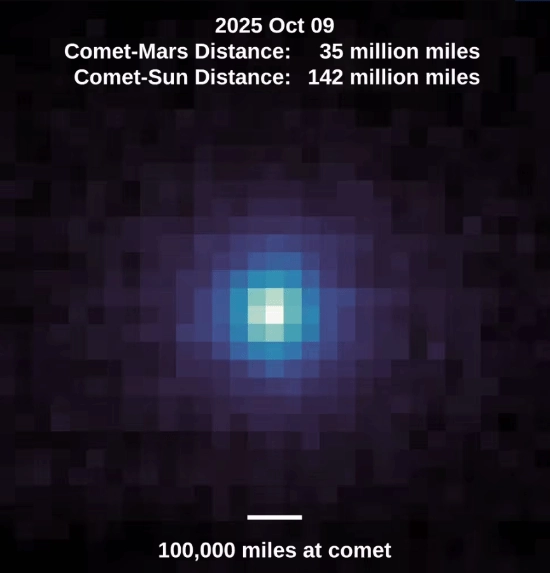 发布会上,NASA 率先展示的是距离彗星最近的探测器,火星勘测轨道飞行器(MRO)于 10 月 2 日所摄图像(当时彗星距探测器约 3100 万公里)。其搭载的 HiRISE 高分辨率相机清晰捕捉到目标。