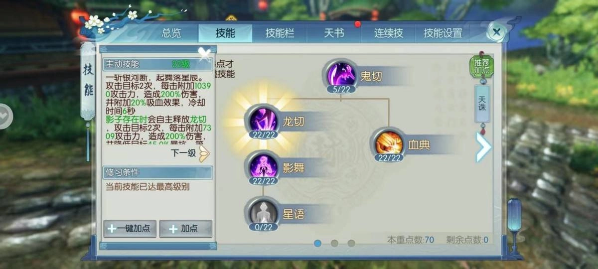1、一重技能加点思路:猛袭+1作为过渡,主要是为了引出后续的血刃技能;矫健+1过渡即可,即便点满提升的血量也比较有限;鬼步+3需加满,不仅能提供加速效果,还具备清除自身不利状态的作用;血毒+4过渡,目的是引出迷踪技能;迷踪+5要加满,搭配天书后可提升6点技能躲闪;丰沛+1过渡就行,点满增加的蓝量也不多;影舞·行+5需加满,这个技能会影响五重影子的气血值;血手+7要加满,能提高攻击力和所有抗性,最关键的是搭配天书后可以提升致命伤害;化影+5作为保命技能使用。