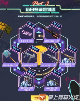 预约成功后,每日签到均可领取武器补给,特别是第六、七、八天,还会有额外的钻石奖励。(所以各位小伙伴务必坚持到最后呀)