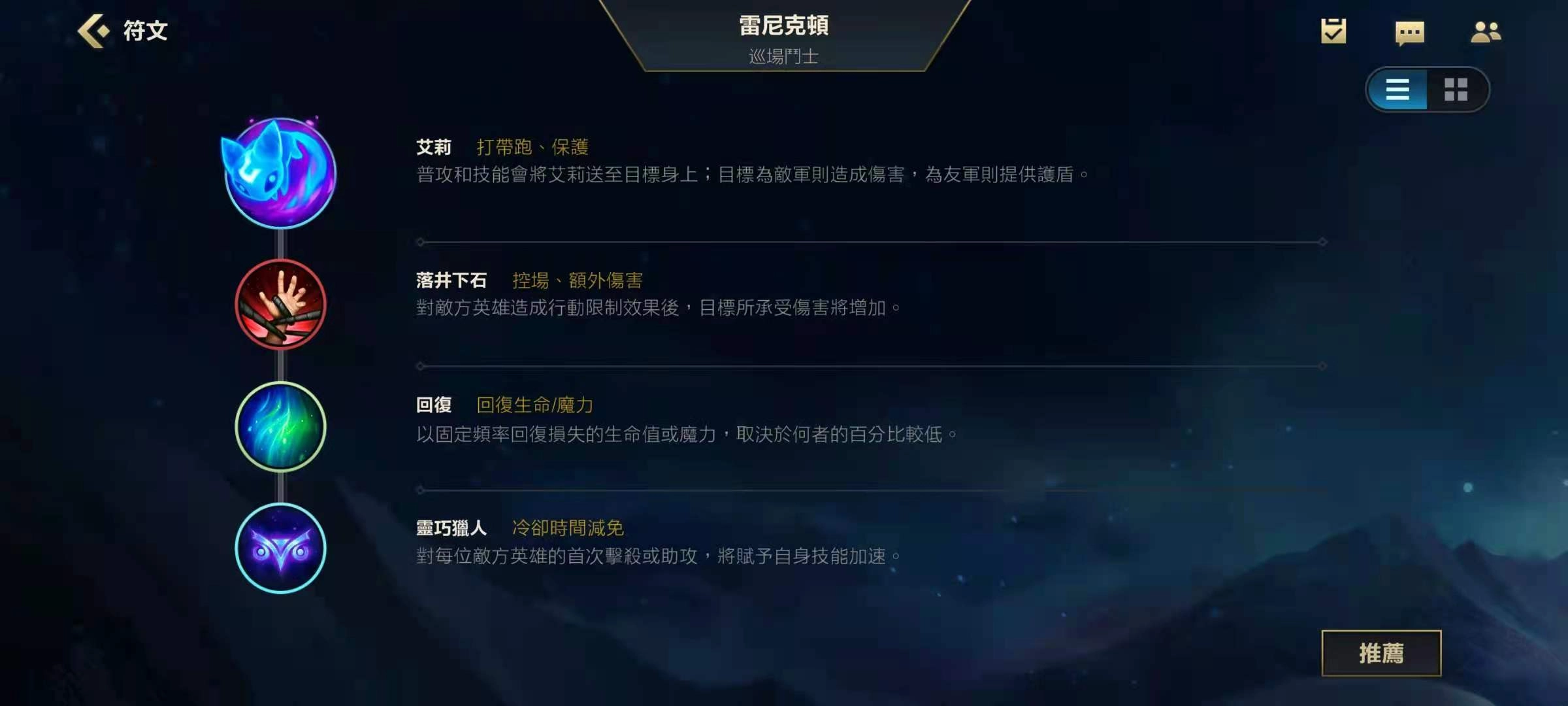 落井下石在限制对手移动后,会提高对手承受的伤害。寒冰的2技能可以减速敌人,借此能轻松触发落井下石,让对手进入易损状态。回复符文能增加寒冰的生命值或法力值回复,由于消耗流寒冰依赖2技能进行消耗,所以法力值续航至关重要,而回复符文会根据携带者法力值和生命值中较低的一项进行回复,实用性很高。最后一个符文选灵巧猎人,寒冰就能额外获得12.5的技能急速,使2技能冷却时间更短,消耗能力也更强。