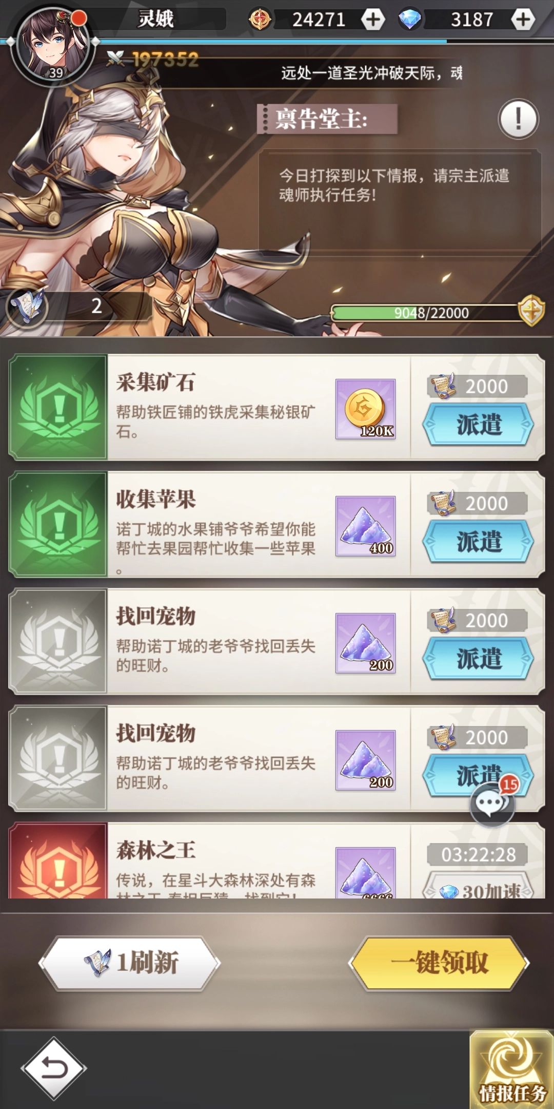情报任务是敏堂特有的玩法,敏堂会不断收集大陆上的各类情报,玩家需要消耗情报值来派遣魂师完成这些任务,像采集矿石这类任务就能提供丰厚的金币奖励。