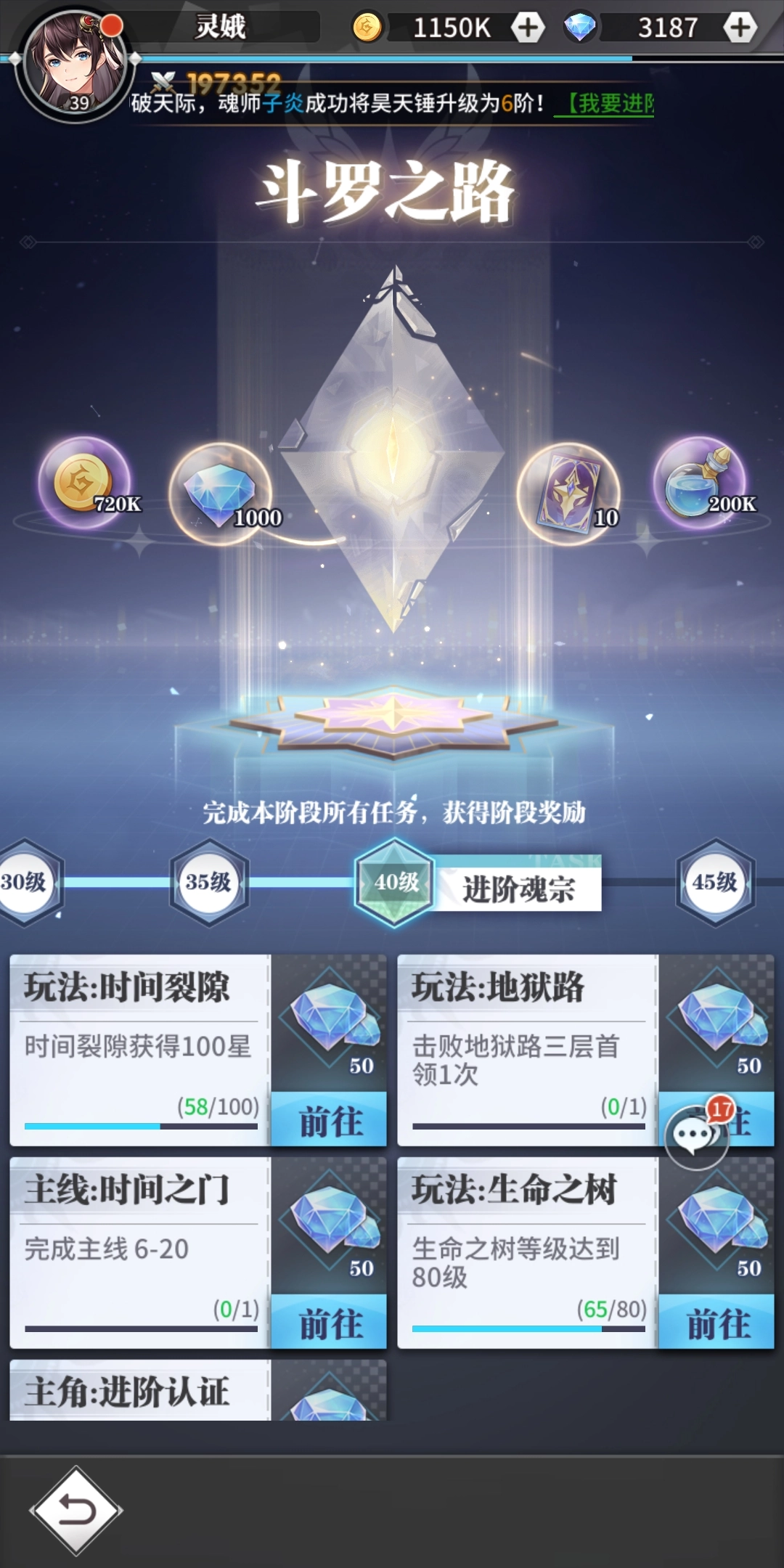 斗罗之路是一项永久的成长任务,一般每5级会开启一系列阶段任务,需要先完成时空裂隙等小任务,之后就能领取包含大量金币、钻石、经验在内的奖励。