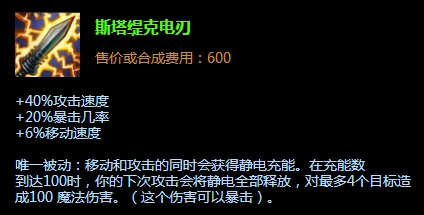 薇恩最关键的属性是攻击速度,因此建议给她再搭配一件电刀。由于当前羊刀尚未在手游中上线,电刀刚好能满足薇恩对暴击和攻速的需求,同时电刀触发的闪电效果还能提升她的清线能力——毕竟薇恩自身的推线能力本就比较弱。