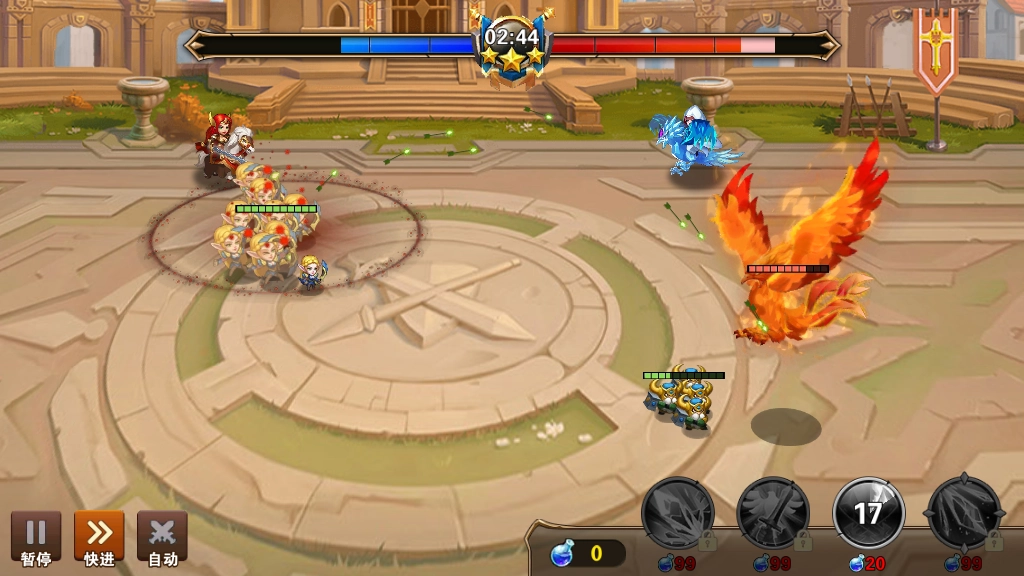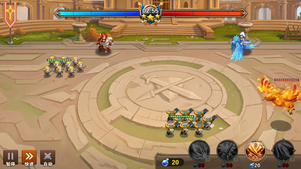 火凤凰的输出能力极高,我方前排兵团很快就会难以抵挡。后方的木精灵虽持续发起攻击,但对火凤凰造成的伤害相当有限。此时玩家们只需合理规划英雄技能的释放时机即可。