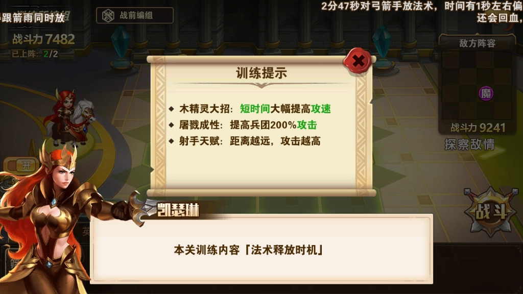 进入这个副本前,系统给出的提示是:射手天赋的特性为距离敌人越远,攻击力提升幅度越大;英雄凯瑟琳的“屠戮成性”技能能让兵团战斗力瞬间暴涨200%;木精灵的终极技能则可在刹那间加快自身攻击速度。唯有将这三条提示融会贯通、协同运用,玩家方能顺利通关。