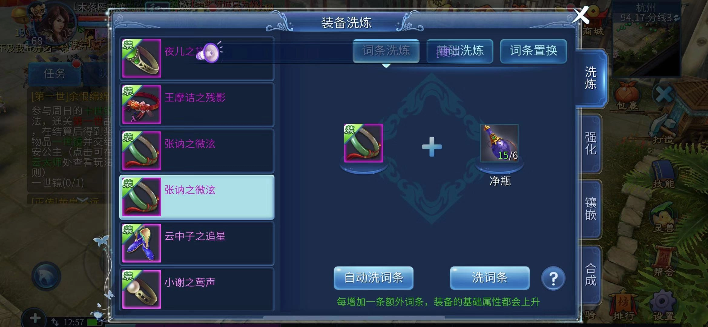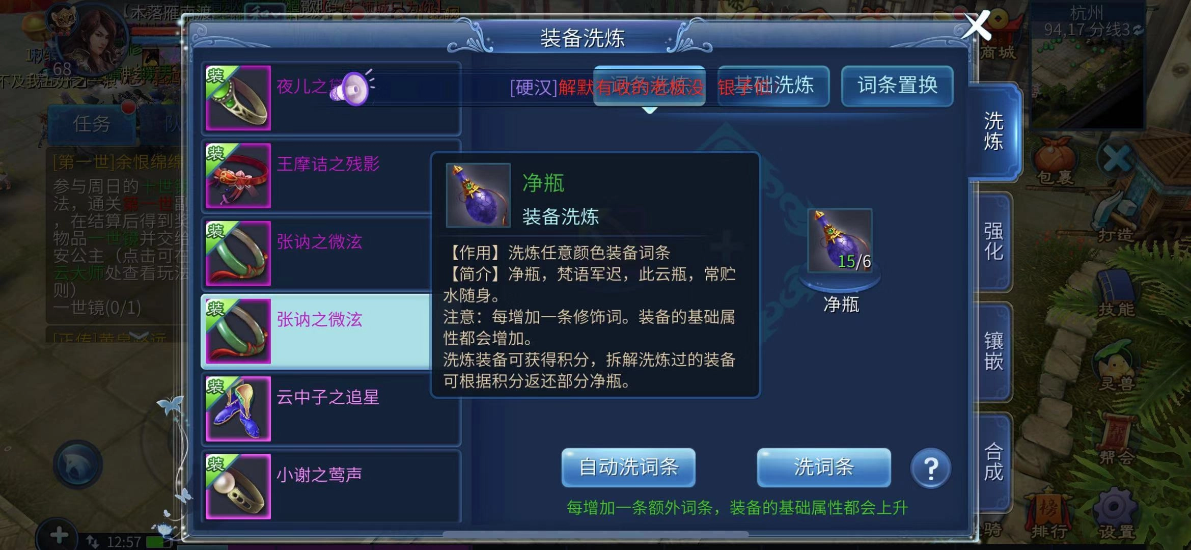 洗炼装备离不开净瓶,若想洗出指定的极品词条,更是得靠不错的运气和足量的洗炼道具。每次洗炼装备要消耗两个净瓶,像“会禄”这样的词条,往往得洗上几十甚至上百次才有可能出,所以玩家得备足净瓶。不过净瓶的获取途径还算丰富。