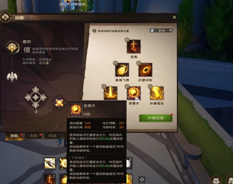 5技能圣爆术:在指定目标地点引动圣光之力发生爆炸,对该区域内的敌人造成相当于自身攻击力52%再加上62点的废法伤害。该技能每命中一个目标,就能返还1秒的剩余冷却时间。此技能法力消耗为200点,冷却时间设定为5秒钟。推荐天赋方面,有两个值得考虑:其一,所有技能的基础法力值消耗降低2%,并且在技能连击时会额外回复4点法力值;其二,强化圣爆术天赋,它能让圣爆术的基础伤害提升5%,同时基础法力消耗降低5%。之所以推荐强化圣爆术这个天赋,主要是因为圣爆术本身的法力消耗非常高。