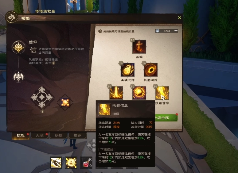6技能:执着信念:向一名友方目标注入信仰之力,让其在后续12秒里加速效果提升15%,攻击力提高73点。该技能消耗70点法力值,冷却时间为90秒,施法范围达24米。推荐搭配天赋:强化执着信念——此天赋能使执着信念的效果增强10%,同时持续时间延长1秒,其核心作用是对该技能进行强化。