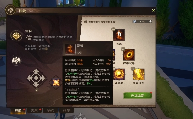这个角色共有6个技能,分别是苦难、圣魂飞弹、折磨试炼、圣能进发、圣爆术和执着信念。其中1技能苦难的具体效果为:施法距离16米,法力消耗70点,能够激发信仰之力攻击目标,造成相当于自身攻击力67%+80点的魔法伤害;若对友方释放,治疗效果会减半,且法力消耗加倍。该技能的基础伤害会提升8%,并且每释放到第3次时,伤害还会额外提高。在天赋选择方面,推荐以下几个强化技能的天赋:- 强化苦难:可让苦难的基础伤害提高8%,同时每次释放到第三次时,伤害额外提升8%;- 灵魂烙印:技能每次造成伤害并形成连击后,能使自身在接下来8秒内攻击力提高0.33%,最多可叠加3层;- 赎罪:苦难命中敌人后,有15%的几率让目标在接下来8秒内持续受到1.6%的魔法伤害。