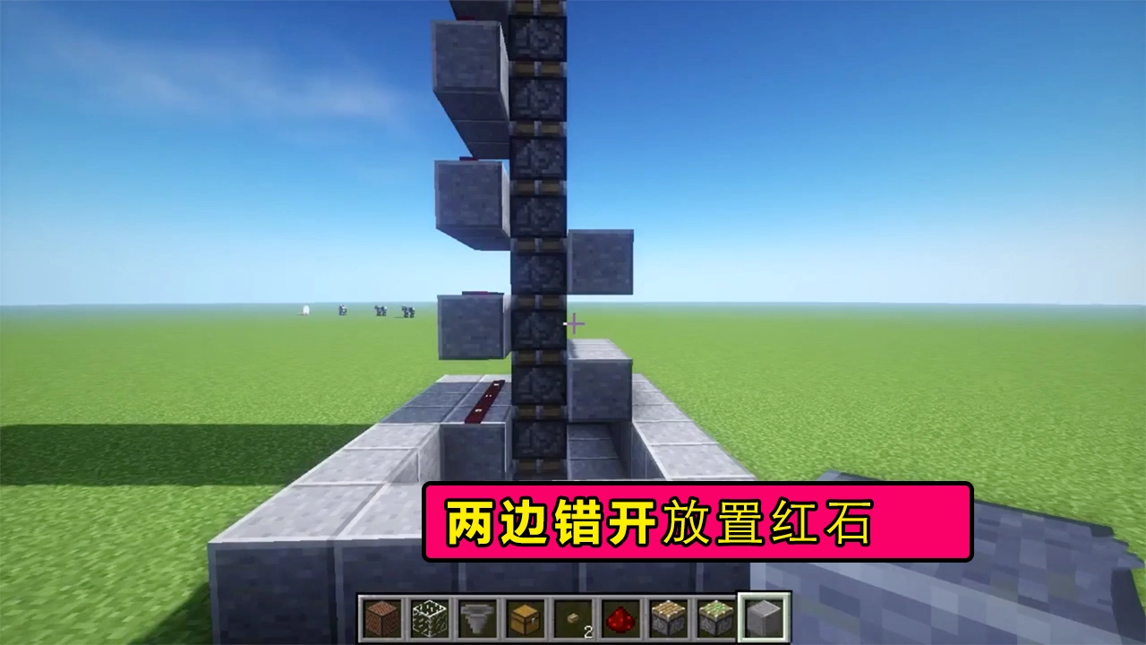 在另一边需要错开摆放三个一排的红石。这一步和上一步完成后,红石电梯的全部基础雏形就已经做好了,这也是我们的整体框架。另外,要在颈部位置放置一个无法移动的方块,这个方块是音符盒。